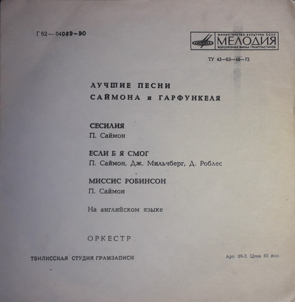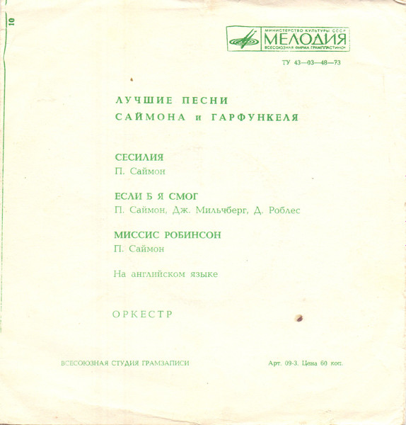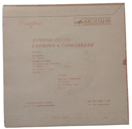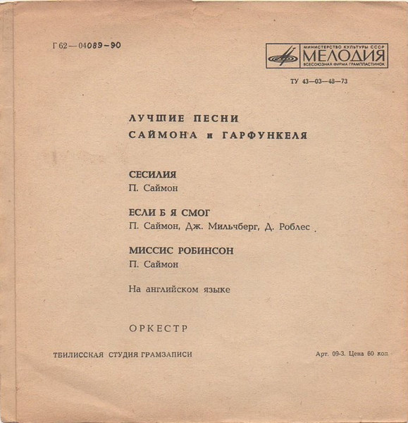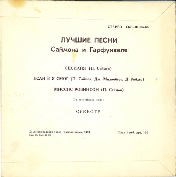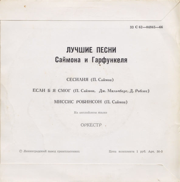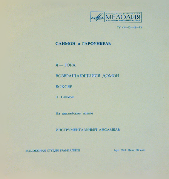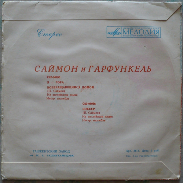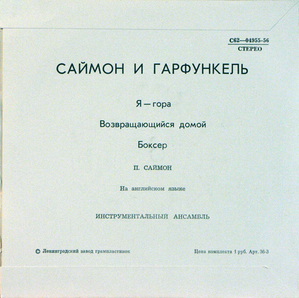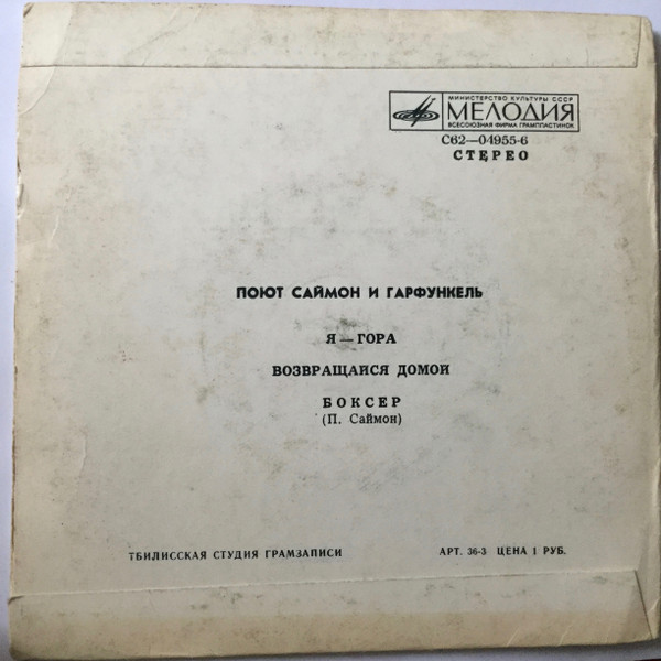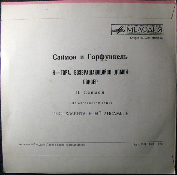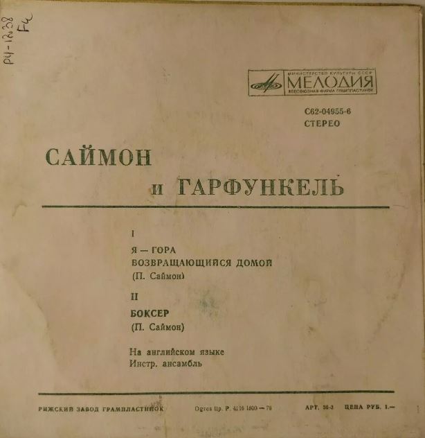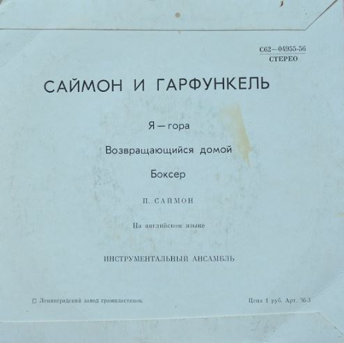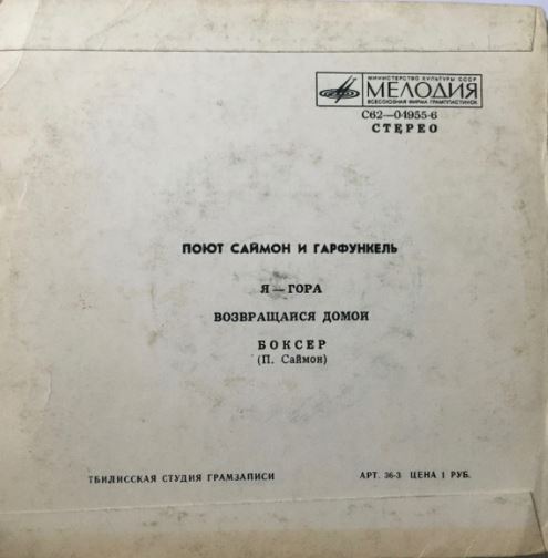 USSR 1974 Single Cecilia / El Condor Pasa / Mrs Robinson USSR 1974 Single Cecilia / El Condor Pasa / Mrs Robinson Cecilia / El Condor Pasa / Mrs Robinson 1974 Single Russia A1 - I Am A Rock / A2 - Homeward Bound / B - The Boxer 1975 USSR I Am a Rock / Homeward Bound (live version from "Simon & Garfunkel's Greatest Hits") / The Boxer |