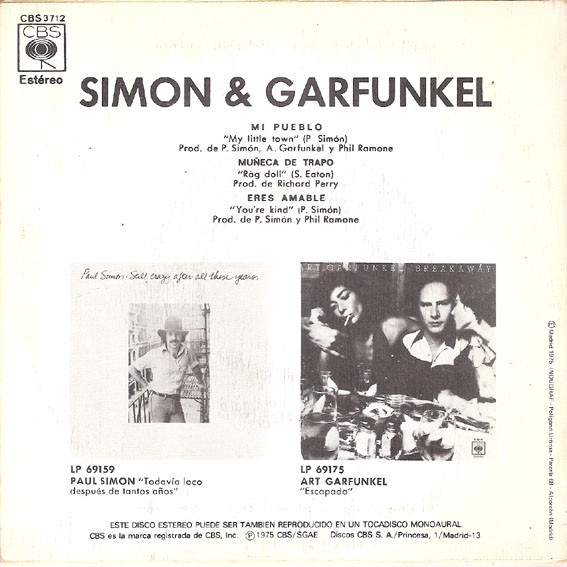 1975 Spain Single My Little Town / Garfunkel Rag Doll / Paul Simon You're Kind |