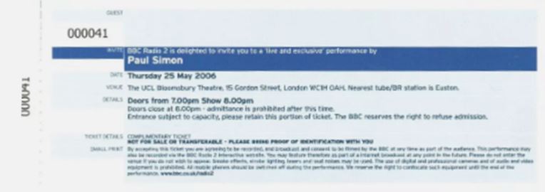 Last Saturday June 3 BBC Radio 2 aired a 58 minutes program with the concert that Paul Simon actually recorded at Bloomsbury Theatre, London last May 25, named Live & Exclusive for BBC. Paul and his band did a really great performance, utterly perfect, including new versions of some old hits like Diamonds and especially Youre The One. He sang 4 songs from his new album, Surprise, being remarkable his singing of Outrageous, Father & Daughter and Wartime Prayers, that closed the show. Here we upload a new pic from this concert, coming from BBC website.Tracklisting of the show as aired by BBC