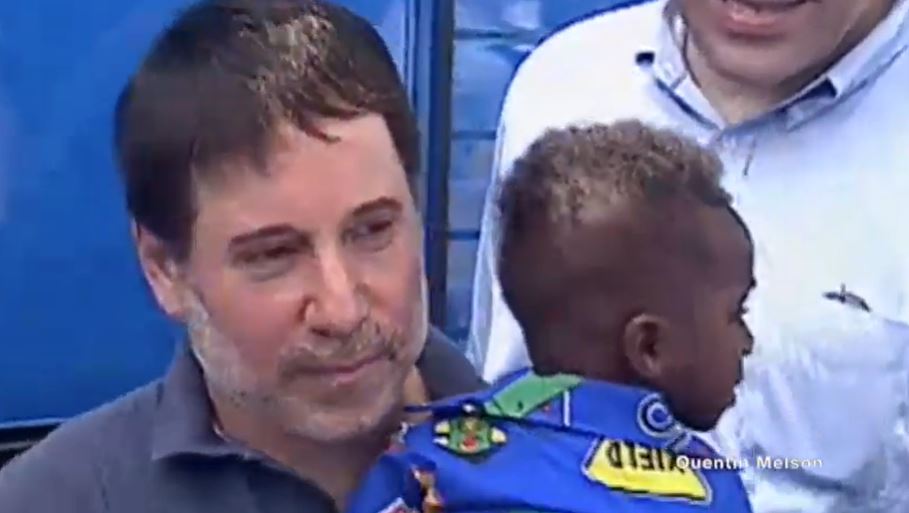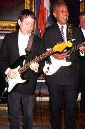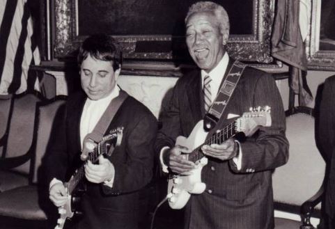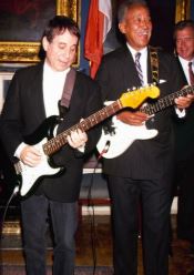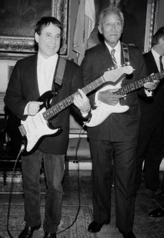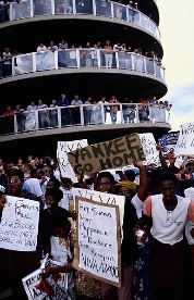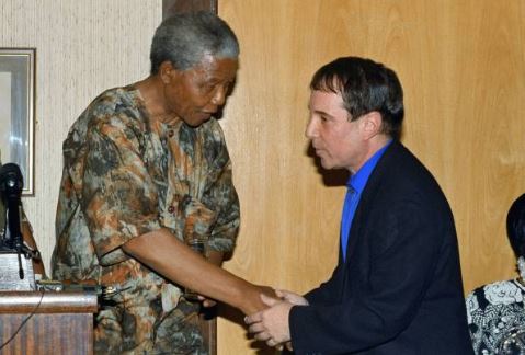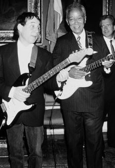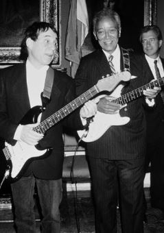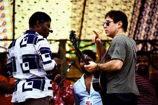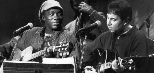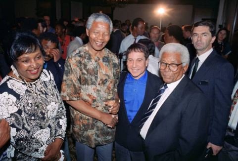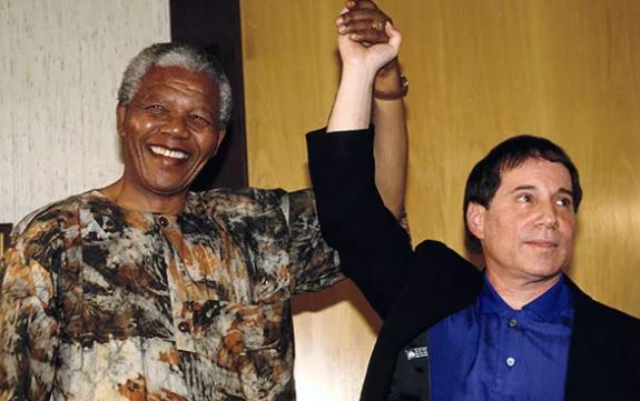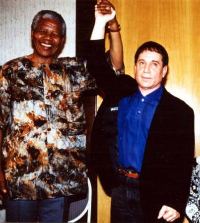 Park Stadium African national Congress President Nelson Mandela shakes hands with Paul Simon after he made a public appeal in support of Simon's concert tour at a banquet on January 10, 1992 in Johannesburg. The ANC has offered to provide security assistance for the tour, which has been threatened by black extremist groups. |