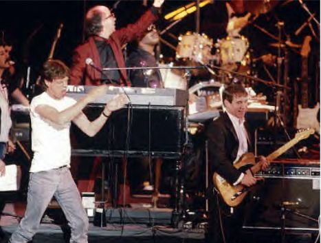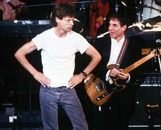 Rolling Stones singer Mick Jagger, keyboardists Paul Schaffer and Stevie Wonder, and guitarist Paul Simon perform together on stage.
