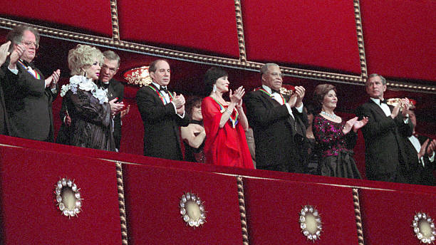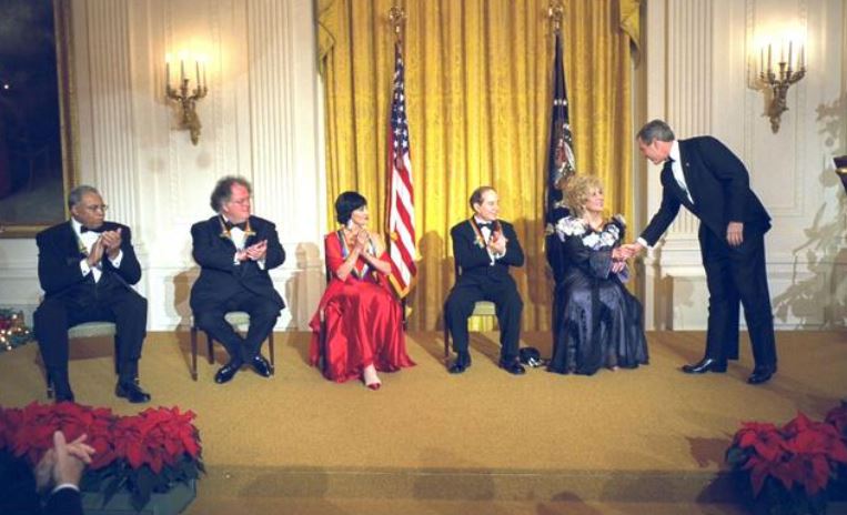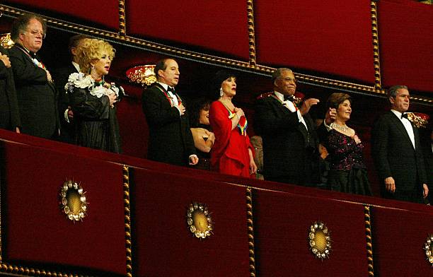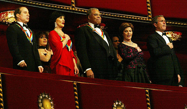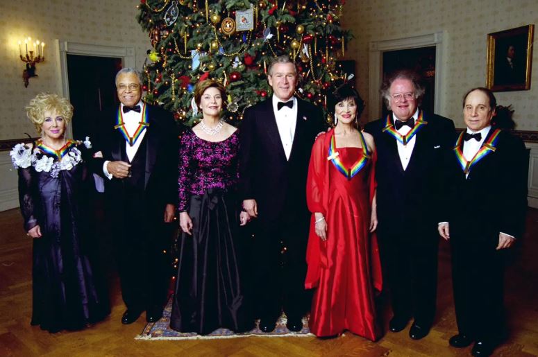 2002 Kennedy Center HonorsWASHINGTON - DECEMBER 8: U.S. President George W. Bush (R) and first lady Laura Bush (2nd R) sing the National Anthem with recipients of the 2002 Kennedy Center Honors, (L-R) conductor James Levine, actress Elizabeth Taylor, singer Paul Simon, musical theater actress Chita Rivera and actor James Earl Jones prior to a gala performance December 8, 2002 at the Kennedy Center in Washington, DC. The Kennedy Center honored the recipients of the 2002 Kennedy Center Honors for their contributions to the cultural life of the nation.