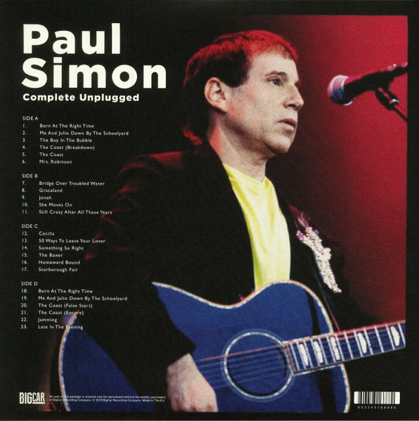 Paul Simon Unplugged MTV presented the planetary premiere of "MTV Unplugged" with Paul Simon. This marked the first time since the series' debut in 1990 that an episode of "MTV Unplugged" aired globally within a 24 hour time frame. The special presentation of "MTV Unplugged" with Paul Simon was taped at the Kaufman Astoria Studios in New York City in March of 1992. Backed up by the band members from his recently completed "Born At The Right Time Tour," Simon performs classics and new material spanning his over two decade career. Song selections performed include "Homeward Bound," "Boy In The Bubble," "Late In The Evening," "Something So Right," "Bridge Over Troubled Water," "Mrs. Robinson," "Still Crazy After All These Years," "Graceland," "Me And Julio Down By The Schoolyard," and "Born At The Right Time." Band member credits go to Michael Brecker (saxophone), Chris Botti (trumpet), Steve Gadd (drums), Cyro Baptista (percussions), Mingo Araujo (percussions), John Selolwane (guitar), Ray Phiri (guitar), Armand Sabal-Lecco (bass), Tony Cedras (accordion), Richard Tee (piano) and Vincent Nguini (guitar).