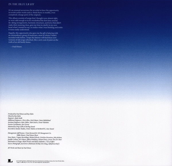In the Blue Light is the fourteenth solo studio album by American folk rock singer-songwriter Paul Simon. Produced by Paul Simon and Roy Halee, it was released on September 7, 2018, through Legacy Recordings.
