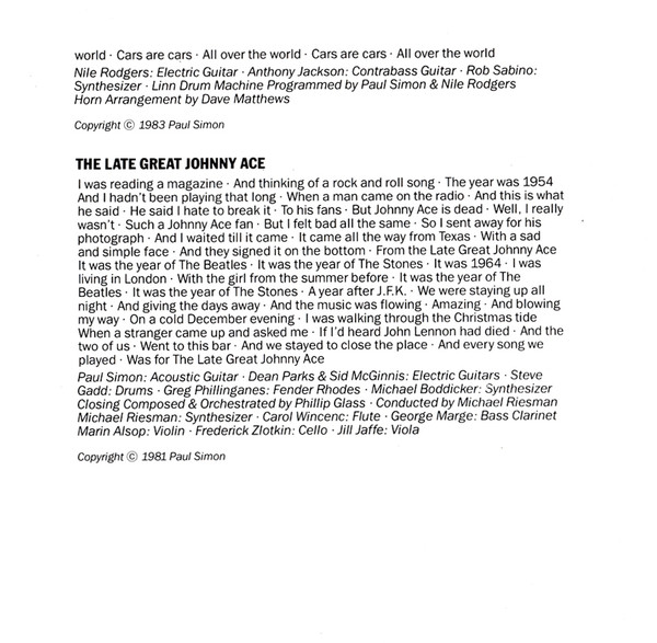 The last track is Simon's homage to John Lennon, who had been assassinated shortly before Simon wrote it. The song and its title also wistfully harken back to Johnny Ace, an early rock and roller who died during a game of Russian roulette. Simon had actually premiered the song during Simon and Garfunkel's reunion concert in Central Park; near the end of the song a fan ran onto the stage, which can be seen in the DVD of the concert. The attack was possibly in response to Simon mentioning John Lennon in the lyrics. The closing music of this track (an instrumental section using strings) was written by composer Philip Glass.