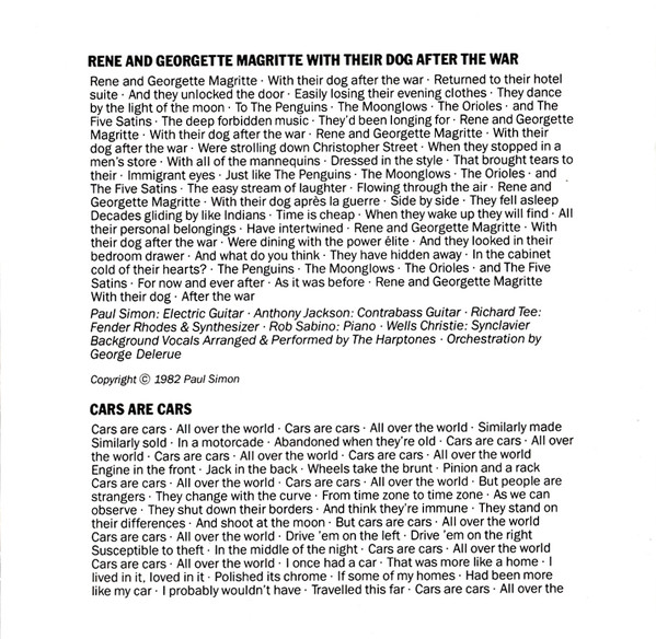 The eighth track is a surreal song about the surrealist artist René Magritte and his wife Georgette, and fancifully suggests that they secretly admired the music of such doo-wop artists as The Penguins, The Moonglows, The Orioles, and The Five Satins. The title derives from a caption to a photograph of the Magrittes, "Rene and Georgette Magritte With Their Dog During the War". Simon changed "During" to "After" as it scanned better for the song lyric.