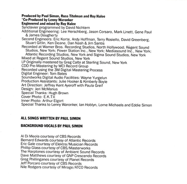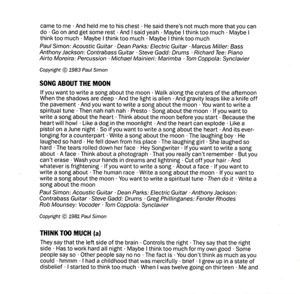 The album was originally intended to be a Simon & Garfunkel reunion album called Think Too Much, following their Central Park reunion concert in 1981, and the world tour of 1982 - 1983.[1] In fact, some of the songs intended for Think Too Much were previewed on the tour. However, creative tensions appeared between the duo during the sessions; Garfunkel supposedly was not comfortable with the personal nature of the songs, and Simon apparently did not want Garfunkel's vocals on the songs. This led to the duo abandoning the project altogether; Simon wiped Garfunkel's vocals from the completed tracks and reworked the songs for a solo album.