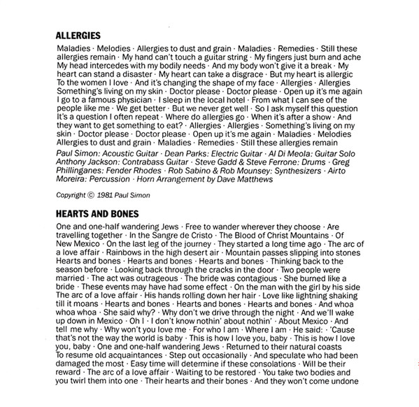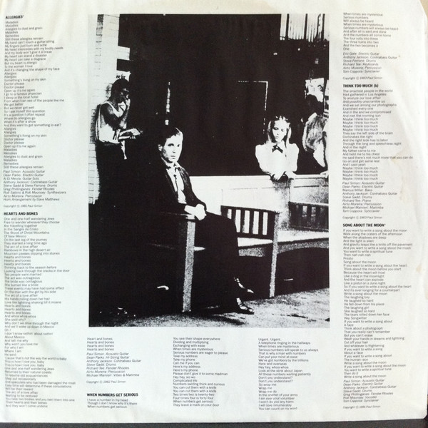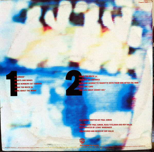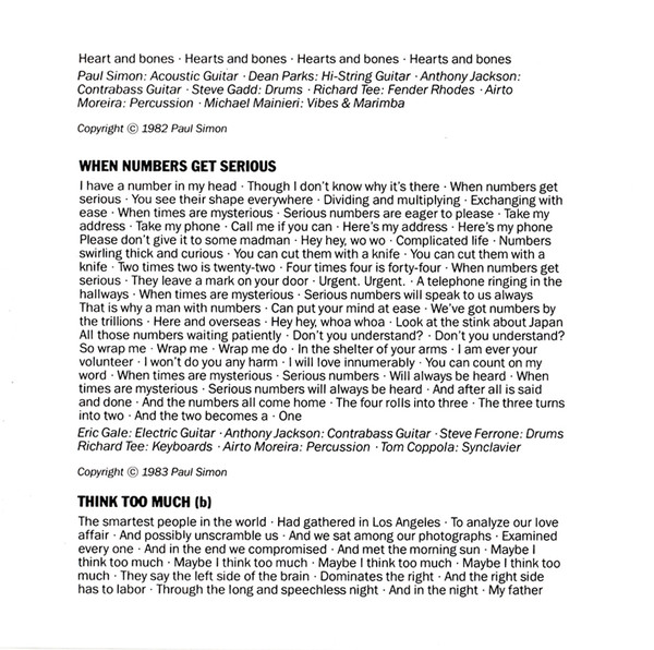 The title track is about Simon and his then-wife Carrie Fisher as they travel through New Mexico ("one and one-half wandering Jews"), and also about love in general. The album also contains one of the few songs about numbers (and love) "When Numbers Get Serious", which evokes the beginnings of the Information Age. Also unusual is "Think Too Much", actually two different songs with the same title and chorus line, dealing generally with thinking (and love).