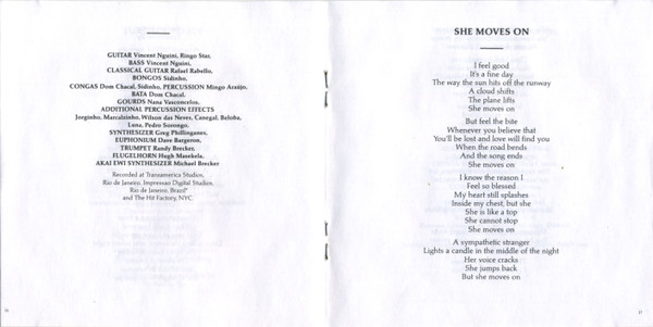 The musical styles on The Rhythm of the Saints are, however, not uniformly Brazilian. Ringo Starr contributes drums on "Further to Fly"; US saxophonist Michael Brecker and other horn players also contribute as session musicians (for example, on "Proof"), as well as American roots rock guitarist J. J. Cale, R&B keyboards player Greg Phillinganes and jazz drummer Steve Gadd. Art rock guitarist and synth player Adrian Belew, who played on Graceland, is credited on "Spirit Voices". There are also many backing vocals on The Rhythm of the Saints, such as "She Moves On", a duet with Charlotte Mbango.