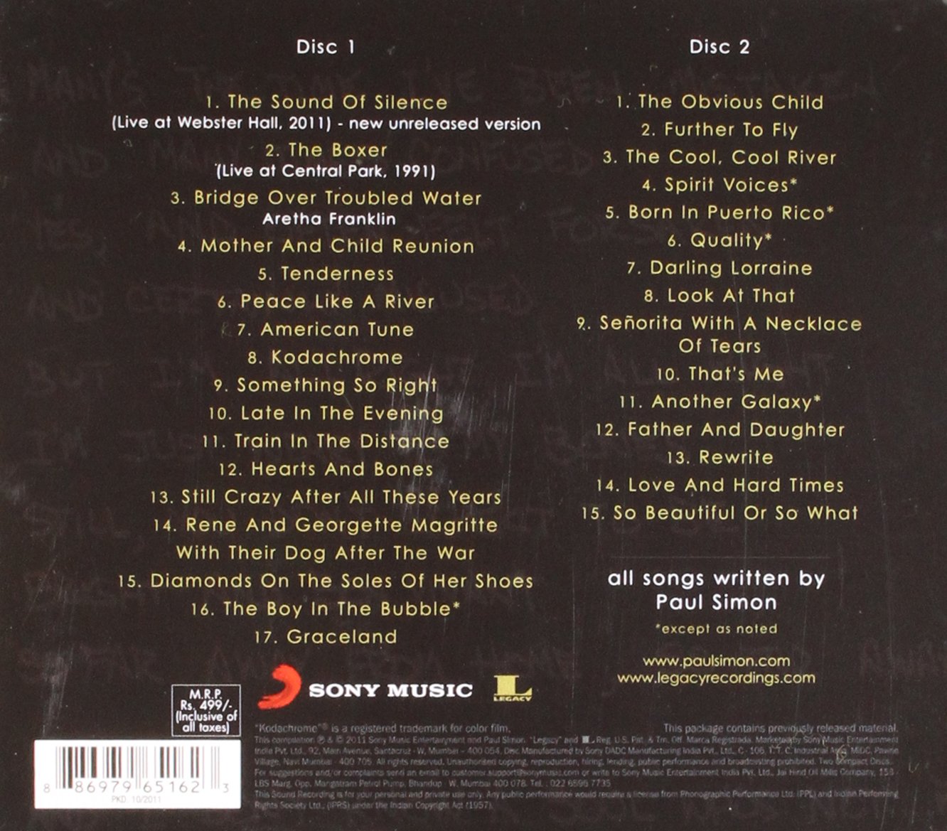 Disc one, which contains most of the "hits" that Simon decided to include, begins with "The Sound of Silence" from a live 2011 performance where Simon plays some interesting harmonic games with the melody. It is a clear indication that this is not going to be a simple recycling of material. There is, of course, no Garfunkel, and that is unfortunate. This is followed by "The Boxer" from the live concert in Central Park and Aretha Franklin's soulful cover of "Bridge Over Troubled Water," the only cover on the album. Other classics included in the collection are "Mother and Child Reunion," "American Tune," "Kodachrome," and "Still Crazy After All These Years." The first disc ends with three songs from Simon's African collaboration "Graceland," "Diamonds on the Soles of Her Shoes," and "The Boy in the Bubble." I would have put in a word for "The Myth of Fingerprints," but I suppose a third and fourth disc would have been necessary for all the songs I would have wanted.