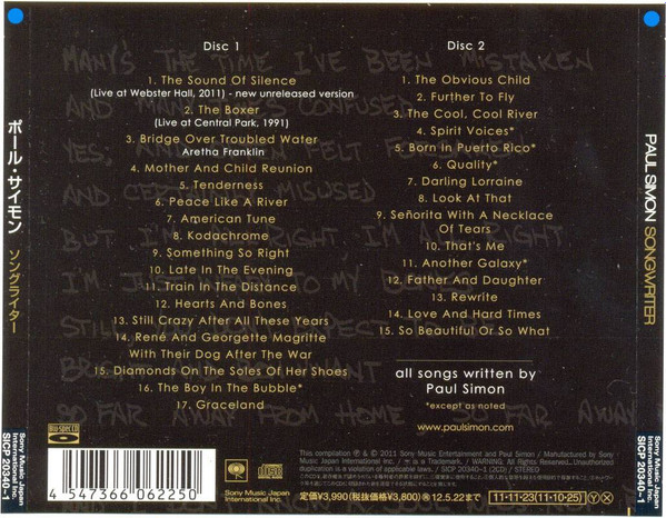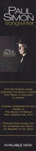 In celebration ofPaul Simon's70th birthday on October 13, Sony/Legacy is releasing Songwriter, a two disc set of 32 songs spanning the composer's fabled career from the sixties to the present. The songs on the album were chosen by Simon himself, and although they include a number of his most famous pieces, this is not a greatest hits collection. Tom Moon, in the liner notes, contends that the album "features commercial landmarks alongside ambitious and often criminally under-appreciated compositions." Now this may be something of an overstatement, but it does, as Moon goes on to explain, allow Simon the opportunity to highlight some of his lesser known songs, songs that are sometimes "overlooked." Whether this will make up for the omission of a ton of fan favorites is problematic.