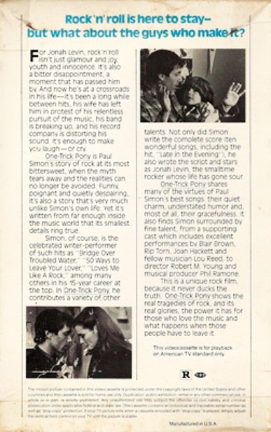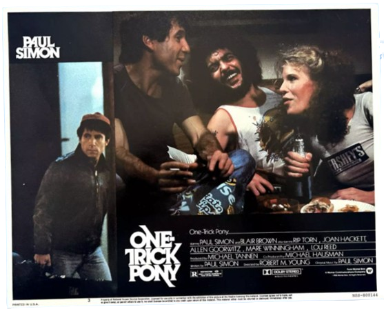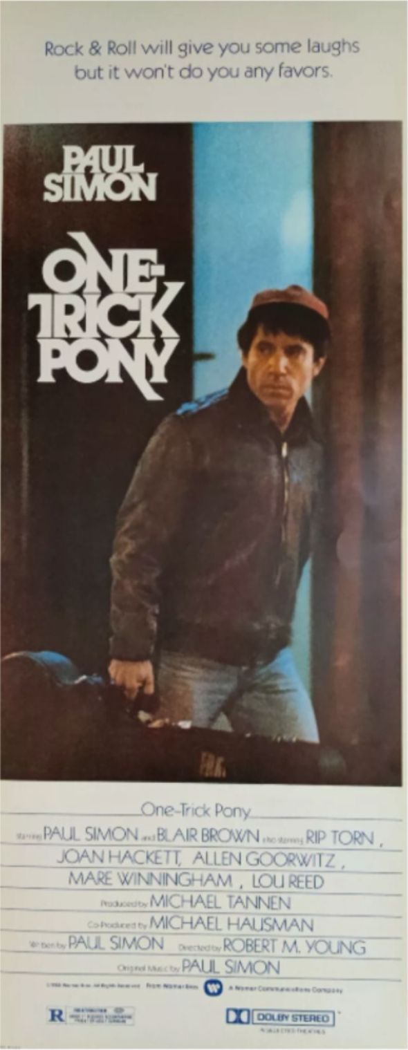 ONE - TRICK - PONY says a lot about the music world and what music means to the performer and audience. And it goes deeper.The movie, Simon explains , "is a lot about what happened to my generation. Somewhere in your early 30s you start noticing that the garment of your youth is becoming frayed. What do you do then ? It's a crucial time and only the very few come through it."