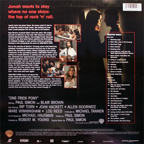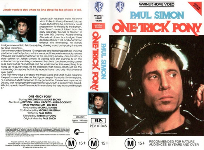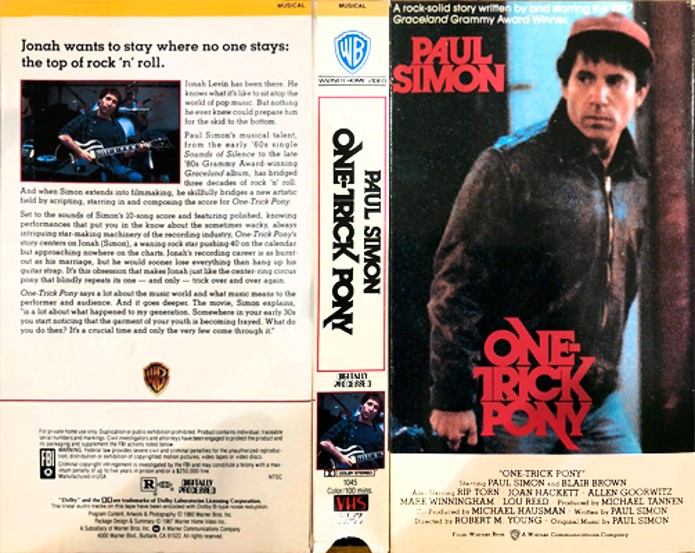 Set to the sounds of Simon's 10-song score and featuring polished, knowing performances that put you in the know about the sometiumes wacky, always intriguing star-making machinery of the recording industry, ONE TRICK PONY's story centers on Jonah ( Simon ), a waning rock star pushing 40 on the calendar but approaching nowhere on the charts.
