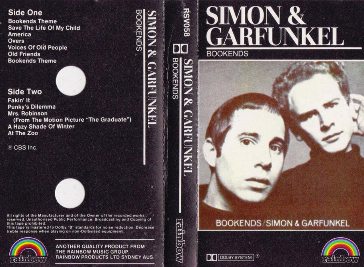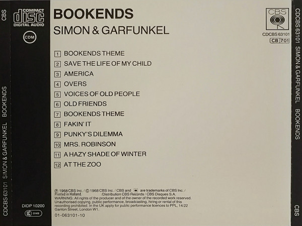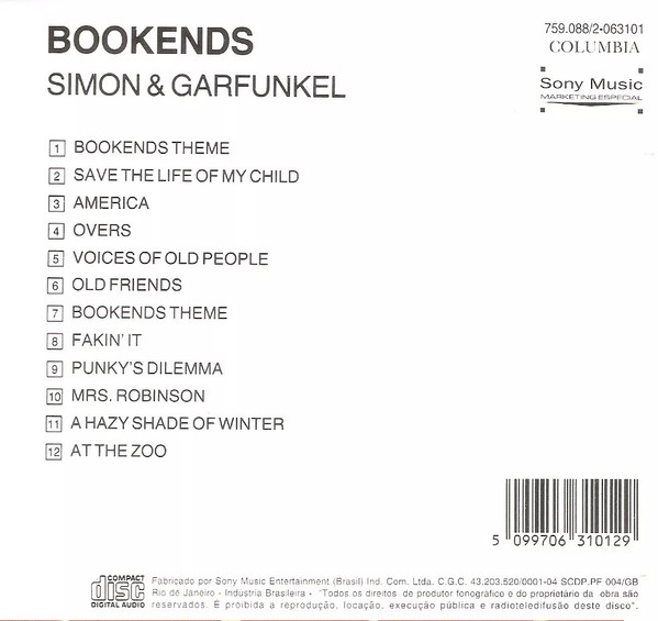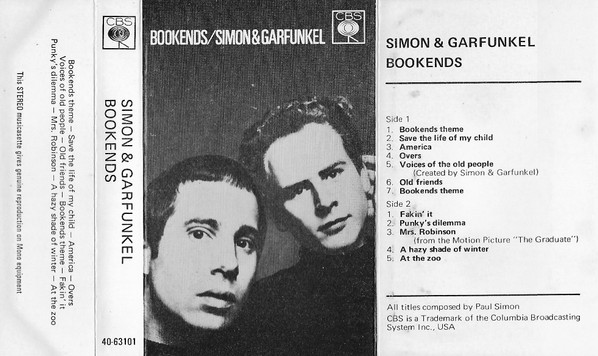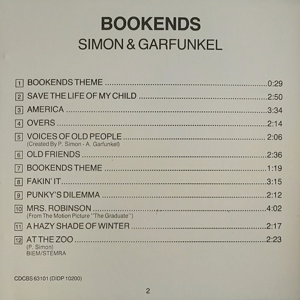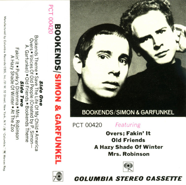 Bookends was a #1 hit on Billboard's (North America) Pop Albums chart, as well as in the UK. Four singles charted: "A Hazy Shade of Winter," "At the Zoo," "Fakin' It" and "Mrs. Robinson," which peaked at #13, #16 and #23 and #1, respectively.