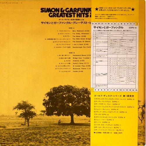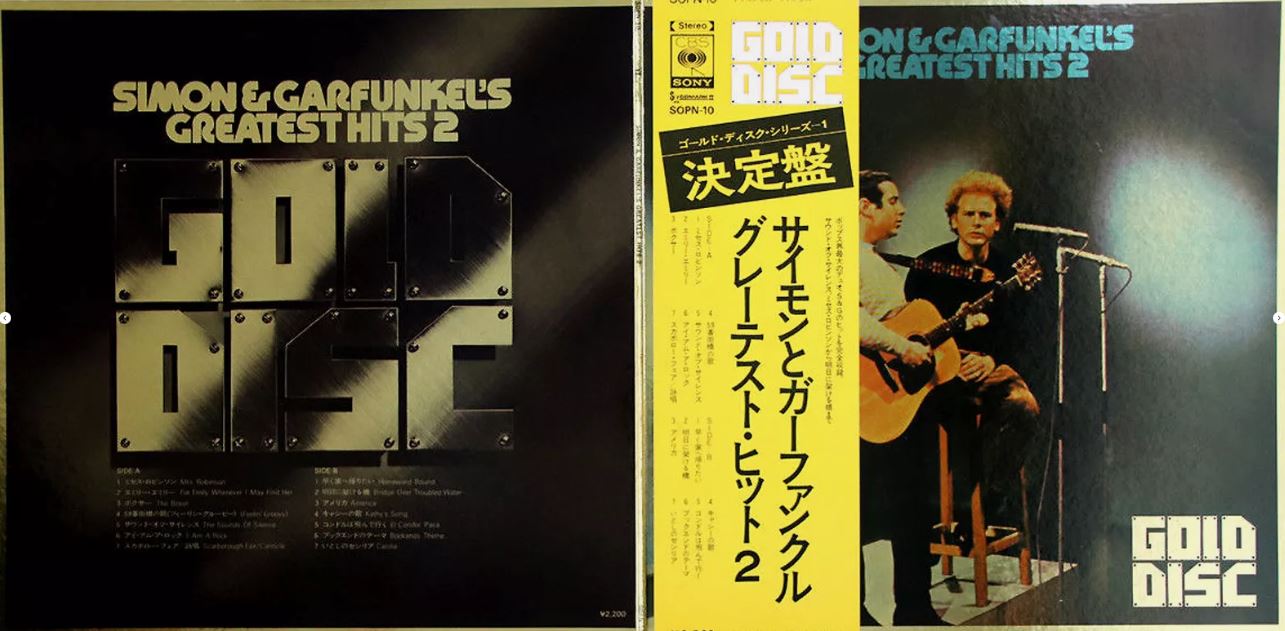 1974 original Japanese only CBS Sony label 14 song vinyl Hits compilation LP, unique metallic looking gatefold cover with nice glossy 8 page booklet featuring photos, Japanese text biography and lyrics, plus wide yellow 'Gold Disc' series obi.