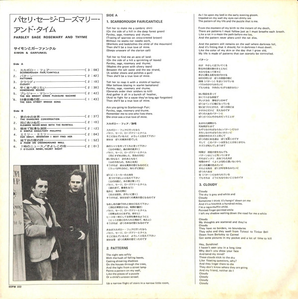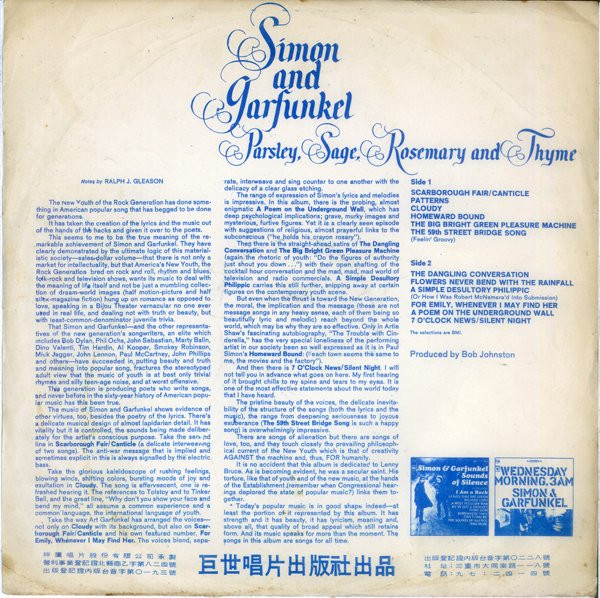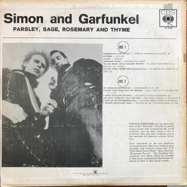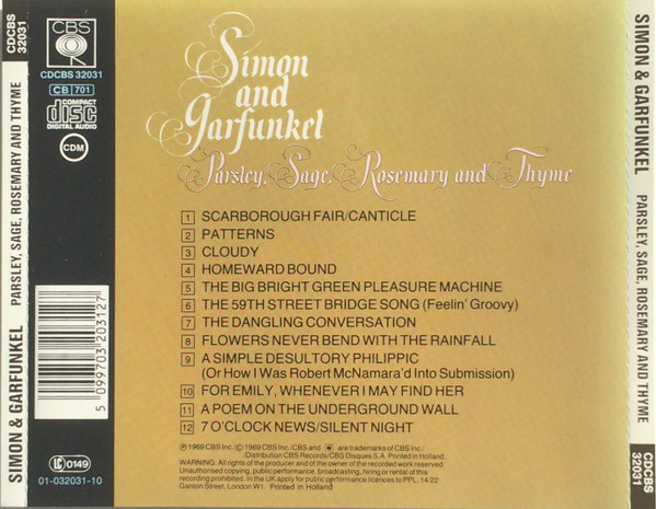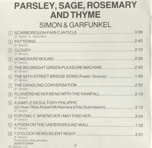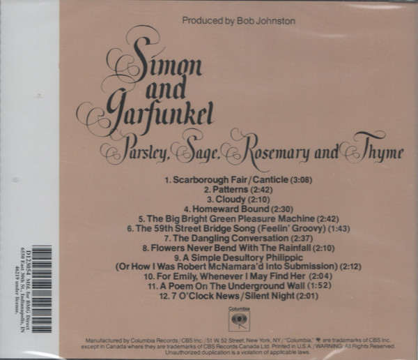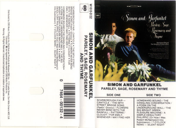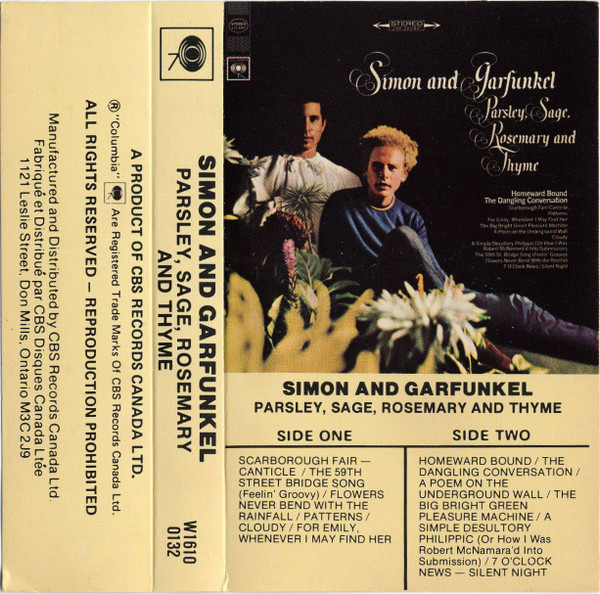 Parsley, Sage, Rosemary and Thyme is an album by Simon and Garfunkel, released in the United States on October 10, 1966. Its name comes from the second line of the album's first track, "Scarborough Fair/Canticle," an English folk song from the 16th century, paired with a counter-melody and text about a soldier. It peaked on the U.S. charts at #4. The album was produced by Bob Johnston as Columbia Records LP CL 2563 (mono); CS 9363 (stereo); CD CK 9363; Remastered CD CK 66001. "Homeward Bound" was excluded from the album in the UK.