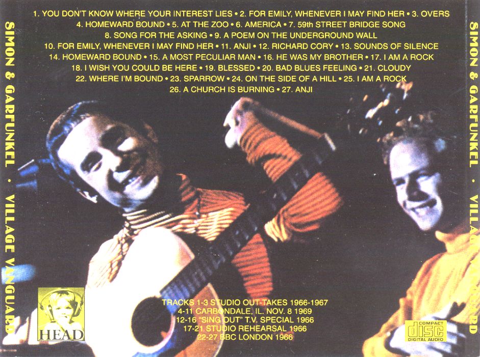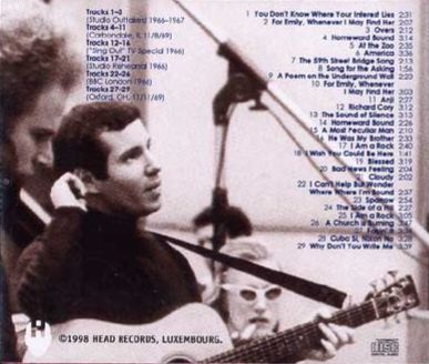 A very interesting and worthwhile, though not superb, collection of 27 live performances and outtakes, spanning 1966 through 1969. The three studio outtakes from 1966 to 1967 include one song that the duo released as a B-side to the Fakin' It single, "You Don't Know Where Your Interest Lies," which is perhaps a bit too insouciant a love song even by Simon's 1966 standards, but has a decent tune. There's also a version of "Overs" with considerably different lyrics than the one that turned up on Bookends. Then there are a few songs from a 1966 "studio rehearsal," though the cover doesn't say whether this is a recording, TV, or radio studio, and some of them sound like Paul Simon solo tracks, with no evidence of Garfunkel. Anyway, these too are noteworthy for including two songs that never appeared on their albums: the nice, folky ballad "I Wish You Could Be Here" and "Bad Blues Feeling," the latter of which shows the influence of Simon's 1965 stint in Britain with its Bert Jansch-type licks. Six songs from a 1966 BBC appearance again yield rarities with a cover of Tom Paxton's "I Can't Help But Wonder Where I'm Bound"; the anti-war "On the Side of a Hill," which never made it onto any S&G albums; and "A Church Is Burning," which only came out on Paul Simon's 1965 solo LP, The Paul Simon Song Book. The nine songs from a November 1969 concert don't have any otherwise unavailable numbers, but do boast the best sound quality of anything on the CD. This bootleg isn't solely notable for the rare compositions, though. The sound is very good at best and very listenable at worst. The performances are fine, and there are renditions of famous hits like "Homeward Bound," "Sounds of Silence," and "I Am a Rock" dotted throughout the program. ~